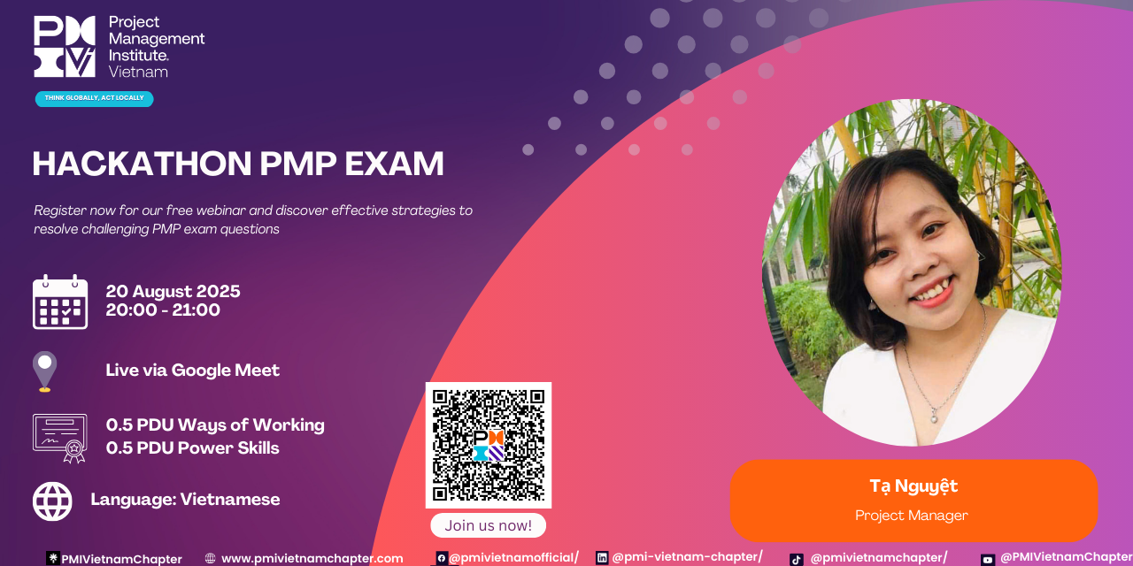 Following the success of 18 PMP Journey sessions with hundreds of attendees, PMI Vietnam Chapter proudly launches the HACKATHON PMP EXAM SERIES – a biweekly online program designed to complement your PMP exam preparation.